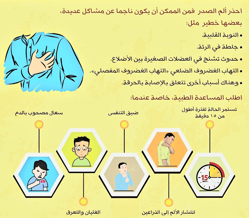كما يُنصح الأطباء دائمًا بعدم التسرع في طمأنة المريض إلا بعد فحصه جيدًا، لأن تشخيص الألم الصدري يحتاج إلى استبعاد دقيق للأمراض القلبية أولًا، ثم بعد ذلك يمكن تأكيد أنه التهاب بسيط في المفصل.